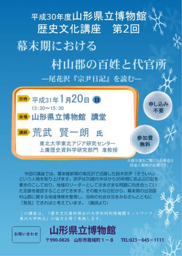 イベント情報 HOME > イベント情報 > 【お知らせ】山形県立博物館で平成30年度第2回歴史文化講座を開催します。 情報更新日 : 2018年12月21日 【お知らせ】山形県立博物館で平成30年度第2回歴史文化講座を開催します。 来る1月20日(日曜)、山形県立博物館で開催される平成30年度第2回歴史文化講座にて、当拠点の荒武賢一朗准教授が「幕末期における村山郡の百姓と代官所―尾花沢「宗尹日記」を読む―」と題して講演をおこないます。 本講座は、「歴史文化資料保全の大学・共同利用機関ネットワーク事業 東北大拠点」の協力でおこなわれます。 → チラシ・ポスター等(PDF) → 参考URL イベント情報一覧をみる
